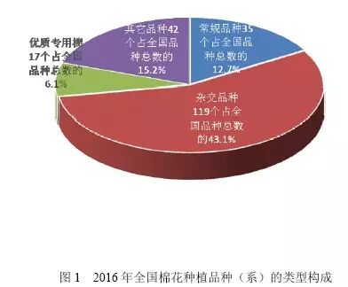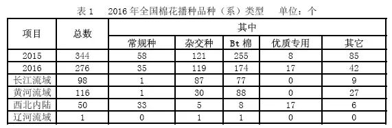 2016年全国棉花播种品种(含没有审定的品系、组合、材料、代号和不知名等,后同)276个(表1、表2,图1),比2015年344个减少68个品种,减幅19.8%。其中: