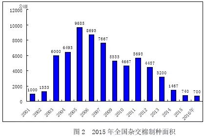 监测结果,2016年全国杂交棉制种收获面积减少至1050亩(700公顷)(图2),比2015年减少5.4%,毛子产量1035吨,比2015年减28.6%。制种地点主要在河北的邯郸、沧州地区与四川盆地,河南较为分散,江苏大幅减少。制种面积大幅减少的主因,一是制种“人工难找,工价极高”。二是“两系”等轻简制种方法没有取得实质性进步,制种仍需人工去雄和授粉,持续时间长达40天,效率很低。