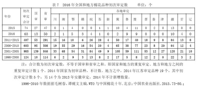 2016年全国初次审定品种为63个(表7),同比减少11个,同比减幅14.9%,审定数量是自2004年(审定67个)以来最少的一年。大省之中,新疆审定数量10个,山东、河北审定9个,可见源头控制仍在继续。然而杂交种26个,占审定数量的41.3%,其中还有2个短季棉杂交种,可见这完全是交账的需要。