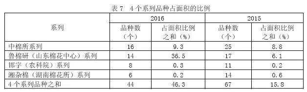 四大系列优势品种(中棉所系列、鲁棉研(山东棉花中心)系列、邯字(农科院)系列和湘杂棉(湖南棉花所)系列)中鲁棉研和中棉所系列具有一定优势,2016年占全国播种面积的46.3%,,特别是鲁棉研系列优势明显占36.5%比2015年增加了30.4个百分点,中棉所系列品种占比9.3%,增0.5个百分点,“湘字系列”和“邯字系列”下降比例很大,几乎不具优势。