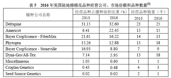 2016年全美经营棉种公司9家(表6),其中前5家公司占市场份额的92.95%。第一家Deltapine公司,占市场份额的32.6%,增1.45个百分点。第二家Americot公司,占市场份额的22.45%,增16.09个百分点。第三家Bayer Crop Science – Fibermax公司,占市场份额的16.22%,减5.39个百分点。第四家Phytogen公司,占市场份额的12.88%,减2.43个百分点。第五家Bayer CropScience – Stoneville公司,占市场份额的8.80%,减8.13个百分点。