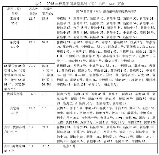 常规棉35个(非杂交种、非转基因、非优质专用)(表1、表2),占品种数的16.3%,减少39.7个百分点,占播种面积的45.9%。