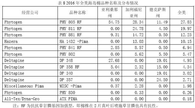 据美国农业部监测报告,2016年美国比马(海岛棉)种植品种13个,比2015年多1个,主要分布在亚利桑那州、加利福尼亚州、新墨西哥州和德克萨斯州,主要品种是PHY 805 RF、PHY 811 RF和PHY 881 RF(表8)。